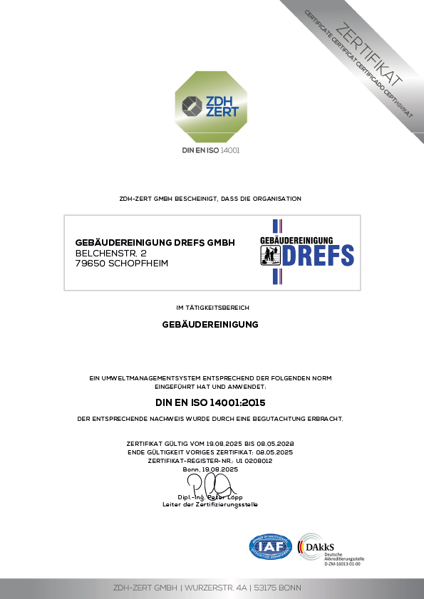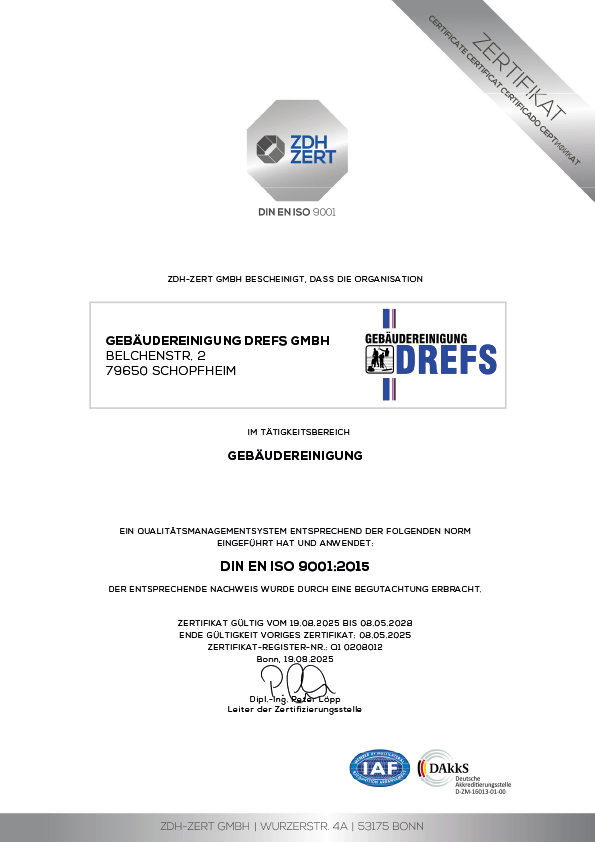 Herzlich willkommen auf der Website von Gebäudereinigung Drefs – Ihrem Ansprechpartner für Reinigungsarbeiten aller Art. Wir sind für Sie da, wenn Sie uns brauchen: Wir sind Ihr zertifizierter Spezialist für Gebäudereinigungen und Dienstleistungen rund um Ihre Immobilien. Seit über 50 Jahren sind wir in der Region als verlässlicher Servicepartner für alle Fälle bekannt. Industrie, Gewerbe, Verwaltung und private Haushalte nehmen unsere vielfältigen Leistungen in Anspruch und vertrauen auf unsere jahrelange Erfahrung.